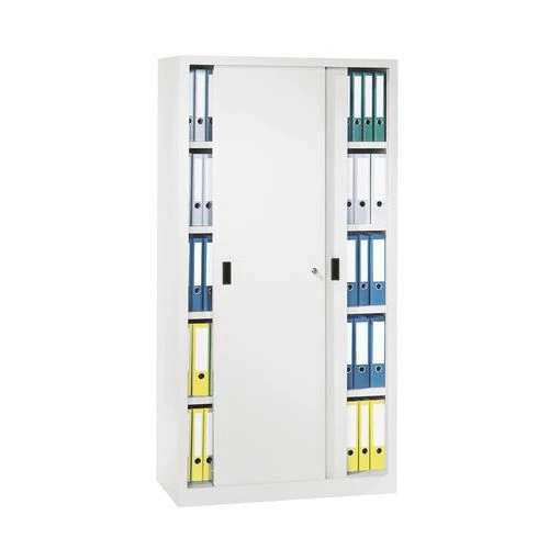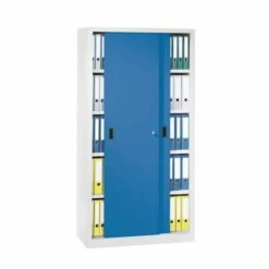 - Stevige hoge gelaste werkplaatskast met stalen schuifdeuren.