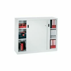 - Stevige lage gelaste werkplaatskast met stalen schuifdeuren.