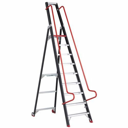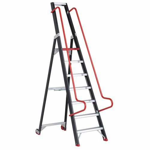 - Magazijntrapladder, eenvoudig te verplaatsen dankzij de vaste wielen aan de achterkant.
