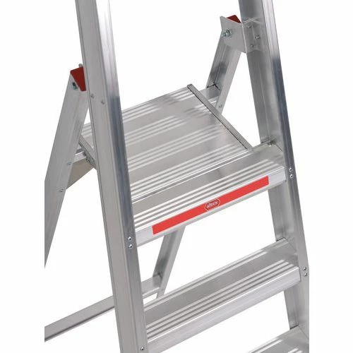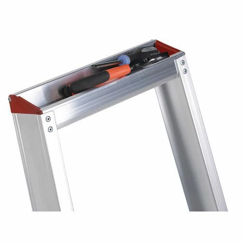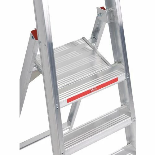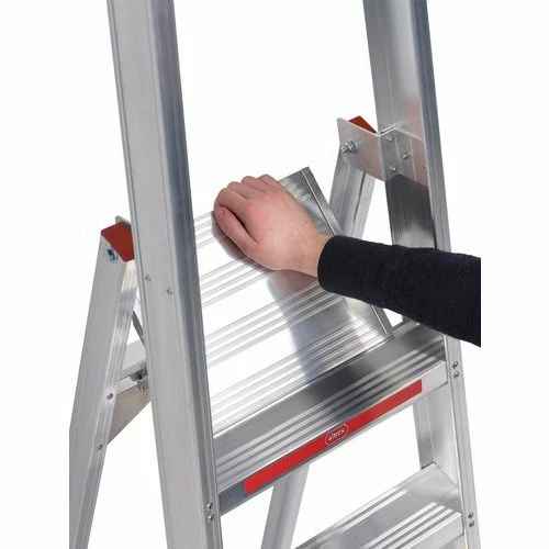 - De trapladder is snel en eenvoudig in en uit te klappen dankzij het scharniersysteem met automatische vergrendeling op het platform.