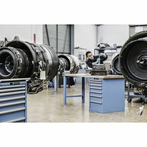 - Werkbank met maximale stabiliteit met een draagvermogen tot 3 t met extreem robuuste en bestendige werkbankplateaus