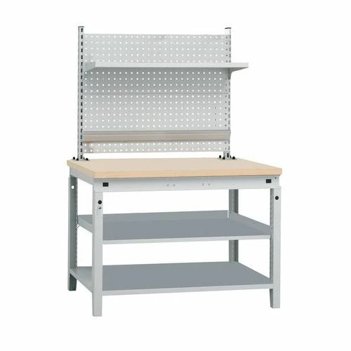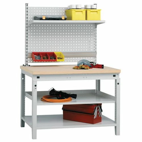 - Stalen werkbank met geperforeerd paneel.